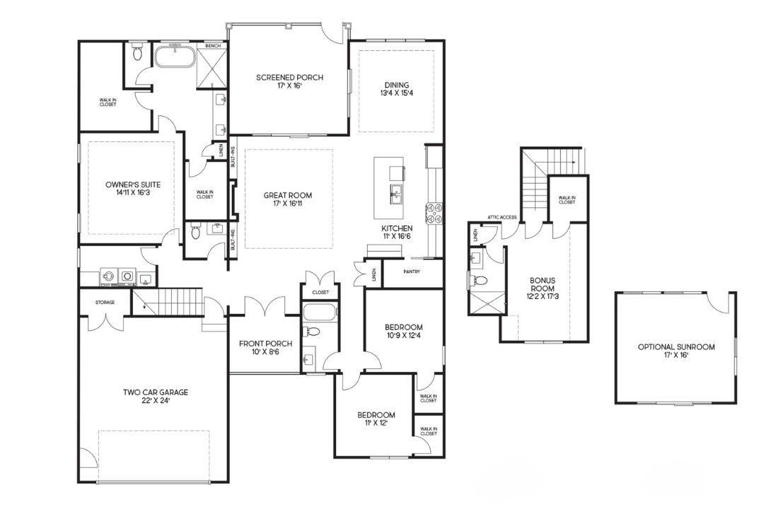 The Daisy II by Kirk Pigford Homes is a masterfully designed 2,665 sq. ft. residence that strikes the perfect balance between luxury and livability. This layout features 3 bedrooms, 3.5 baths, and an expansive upper-level bonus room with its own walk-in closet and full bath, ideal for a private guest retreat or hobby space. The home’s open-concept center is anchored by a 17′ x 16’11” great room with custom built-ins, flowing naturally into a gourmet kitchen and a bright, rear-set dining area. The private owner’s suite serves as a true sanctuary, complete with two walk-in closets and a spa-like bath featuring a bench-equipped shower. With a 17′ x 16′ screened porch (plus an optional sunroom upgrade) and an oversized two-car garage, The Daisy II offers a sophisticated setting for both quiet relaxation and grand-scale entertaining.