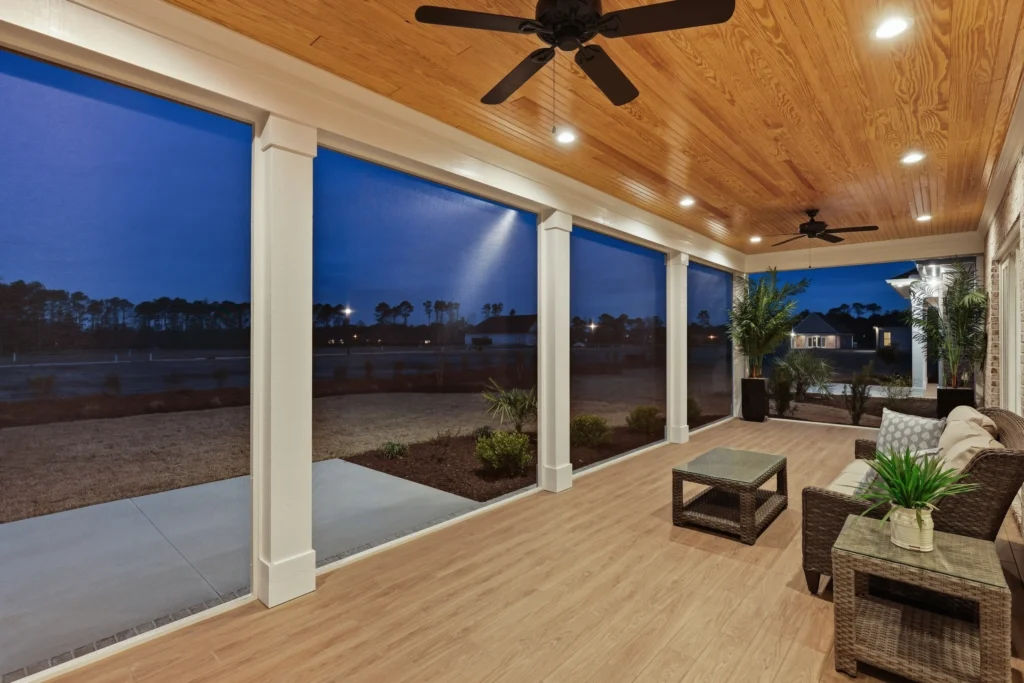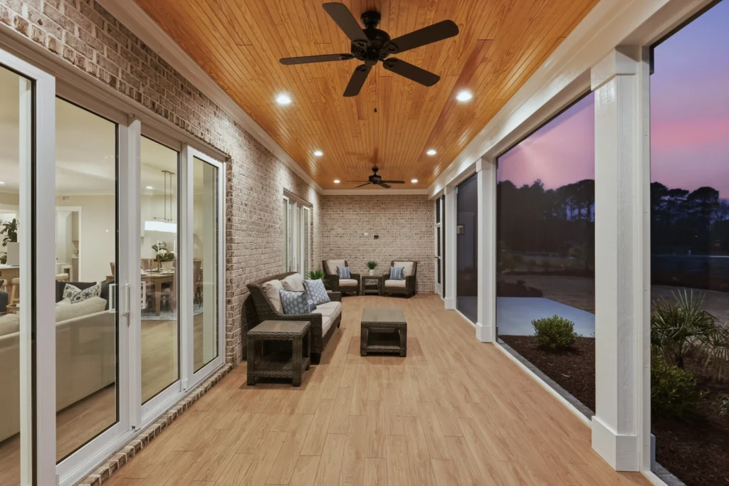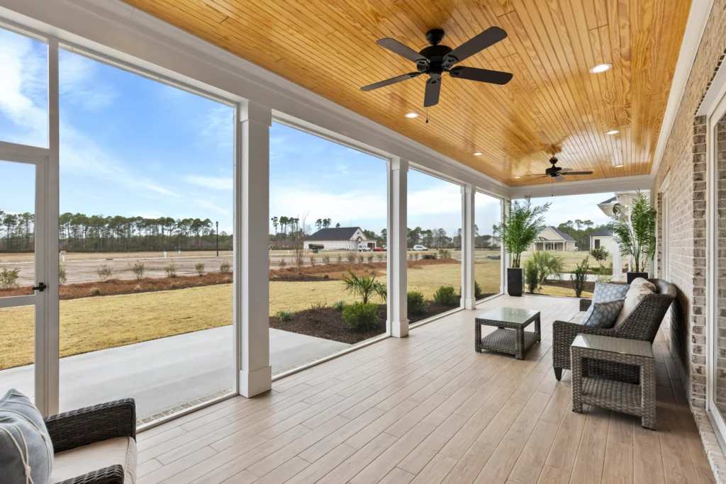 A flex space offers versatility, perfect for a home office, additional bedroom, or playroom. The Seaspray also includes a screened porch for outdoor enjoyment, with the option to add a sunroom for extended indoor-outdoor living. The home has both a two-car and a three-car garage, providing ample parking and storage. With its adaptable design and focus on comfort, The Seaspray floorplan is a wonderful choice for families seeking a well-rounded, functional home layout.